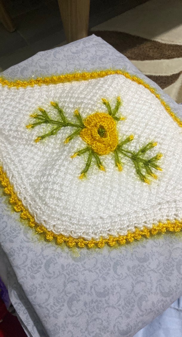 Renkli nakışlı çiçek desenleri ve sarı süslemeli kenarı olan beyaz lif . Yumuşak kumaş ve detaylı işçilik içerir.