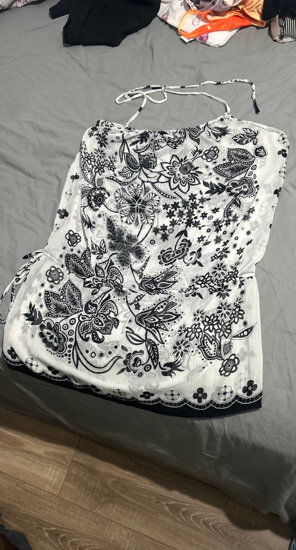 Ayarlanabilir boyun ve bel bağlarıyla beyaz, koyu renk nakışlı çiçek desenli mutfak önlüğü.