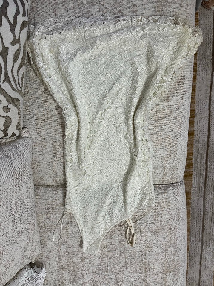 Nakışlı, beyaz renkli, mini boyda ve vücuda oturan beyaz küçük kız elbisesi. Normal uzunlukta ve zarif dantel dokusuna sahip.