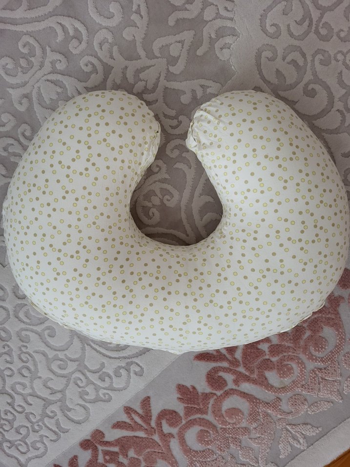 Pastel renklerde nakışlı benek desenli beyaz hamilelik ve emzirme yastığı, rahatlık sağlar.