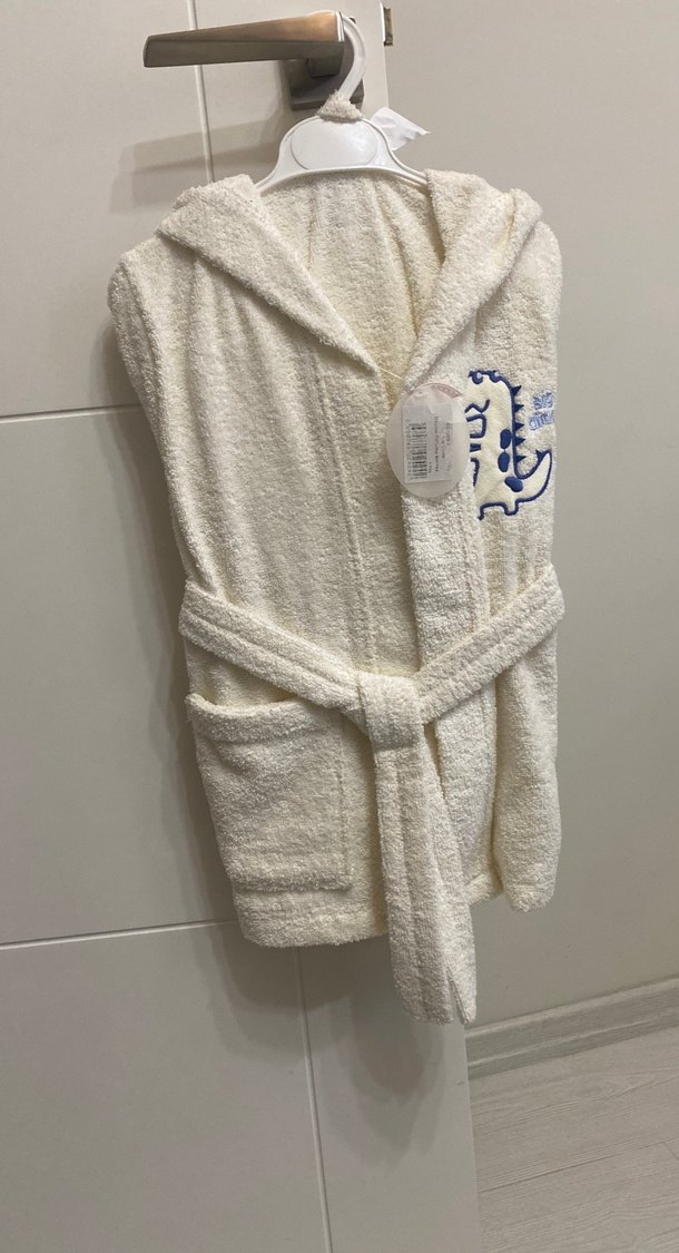 Yumuşak kumaştan yapılmış, kapüşonlu beyaz erkek çocuk bornozu, mavi nakışlı dinozor desenine sahiptir. Bel kemeri ve ön cepleri vardır.