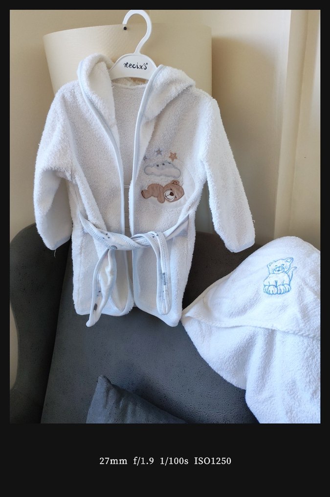 Nakışlı detaylara sahip beyaz erkek çocuk bornozu, kemerli. Aynı nakışlı motifli uyumlu havlu ile birlikte. 50 cm