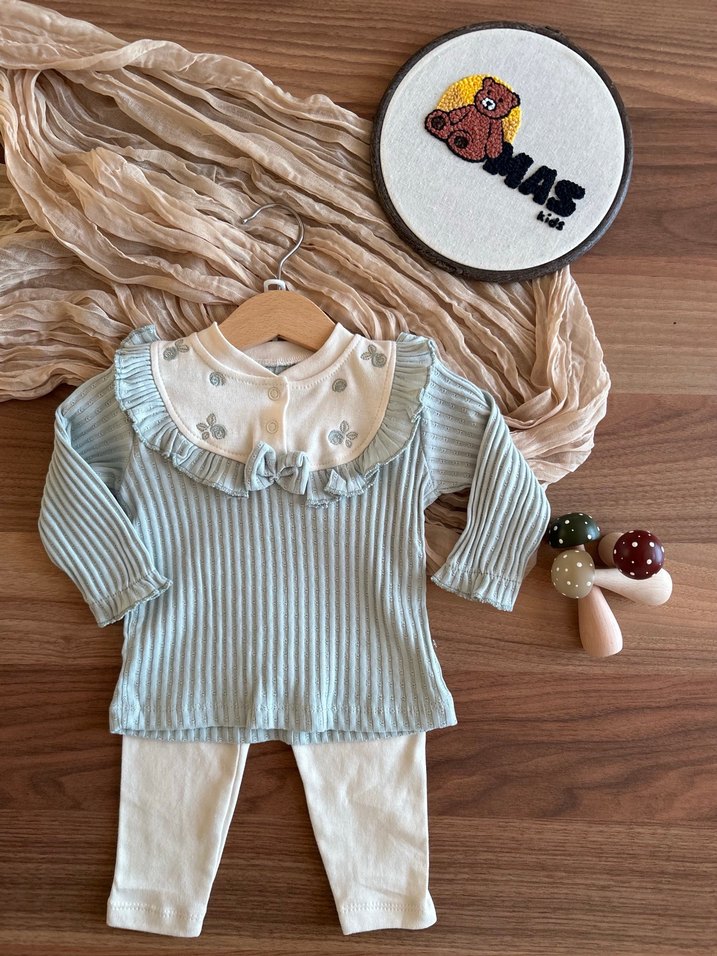 Ürün bedeni: 6-9 ay Pastel mavi uzun kollu, fırfırlı ve nakış işlemeli beyaz yakalı üst ile beyaz pantolonlu bebek kız takımı. Yumuşak ve konforlu kumaş.