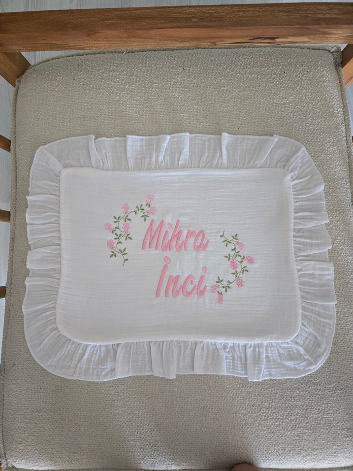 müslin kumaştan hazırlanmıştır. kişiye özel isim nakışlı hazırlanmaktadır.