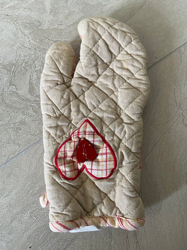Nakışlı kalp desenli, yumuşak kapitone dokulu beyaz fırın eldivenidir. ❤️