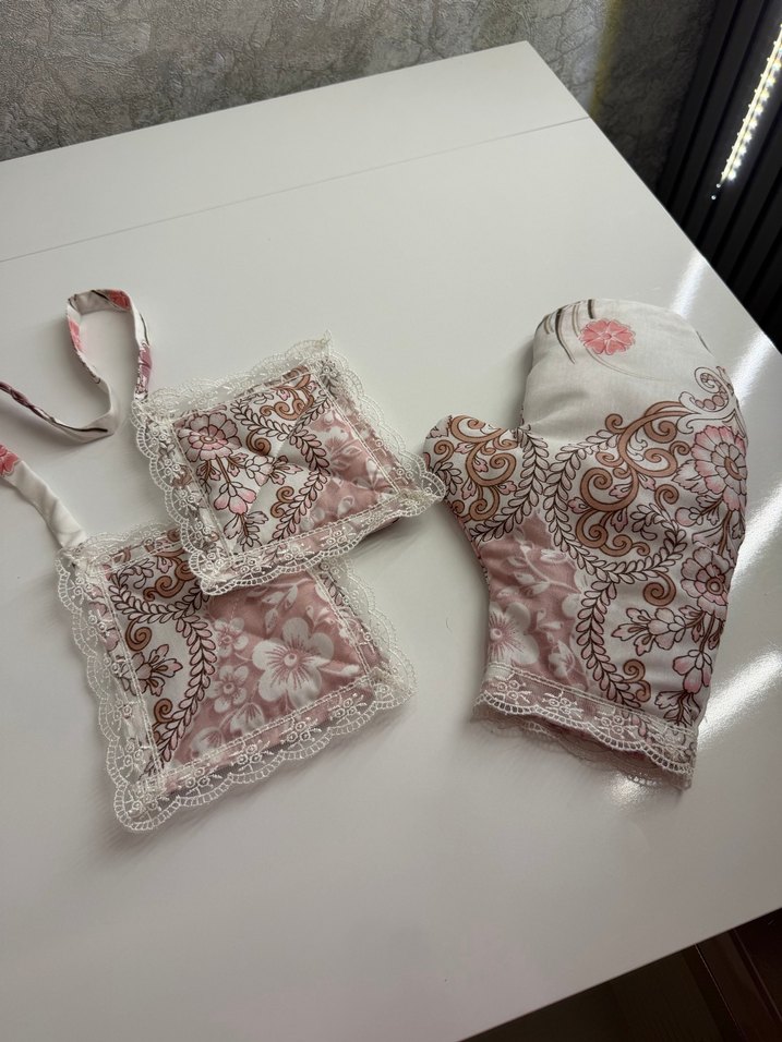 Nakışlı çiçek desenleri ve ince dantel kenarlarıyla pastel beyaz fırın eldiveni ve tutacak seti, mutfağa zarif bir dokunuş katar.