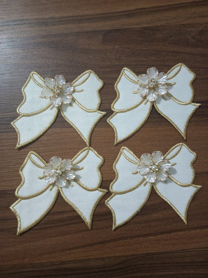 Çiçek detaylı nakışlı beyaz fiyonk broşlar, düğünler için uygun vintage tarzda. Hafif ve zarif tasarım.