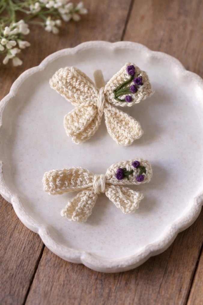 Nakışlı mor çiçek detaylı, yumuşak örme beyaz fiyonk şeklinde çocuklar için bohem tarzda saç tokaları.