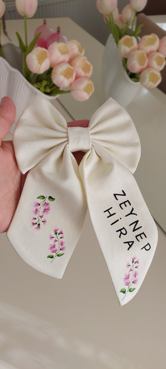 baskılı çiçek detaylı, beyaz fiyonk saç tokası. Üzerinde 'ZEYNEP HİRA' baskılı , pastel bohem tarzda. size özel isim için lütfen mesaj atin