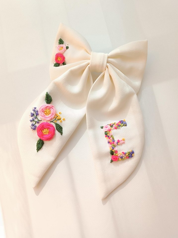 Nakışlı pastel çiçek desenli beyaz fiyonk saç tokası, bohem tarz için uygundur.