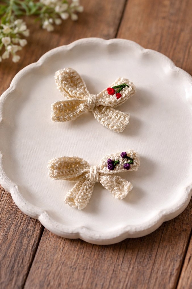Nakışlı çiçek detaylı, yumuşak dokulu beyaz bohem tarzı fiyonk toka seti, çocuk saçlarına zarif bir dokunuş katıyor.