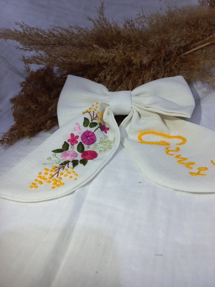Pastel renklerde nakışlı çiçek desenleri ve fiyonk detaylı, bohem tarzda beyaz çocuk saç aksesuarı. isme özel işlenir