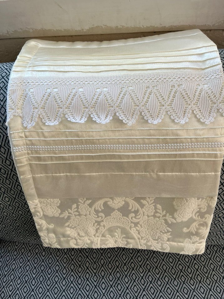 Nakışlı desenlere sahip, parlak beyaz renkte klasik tarzda pike takımı