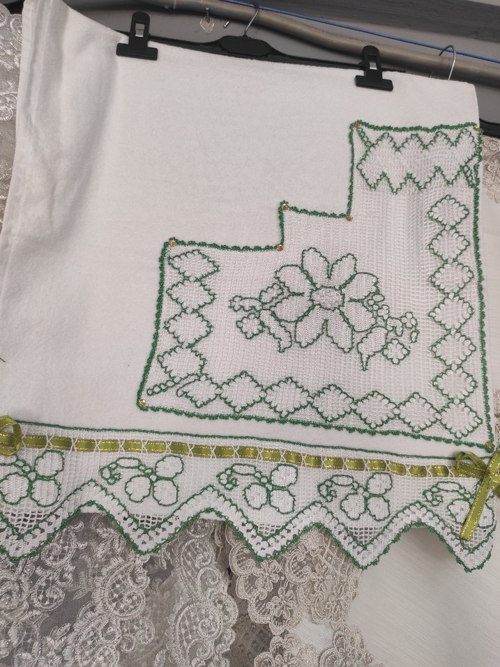 Açık beyaz renkte, yeşil nakışlı çiçek ve geometrik desenlerle süslenmiş, dantel detaylı havlu iki adettir fiyat tek ürün için geçerlidir.