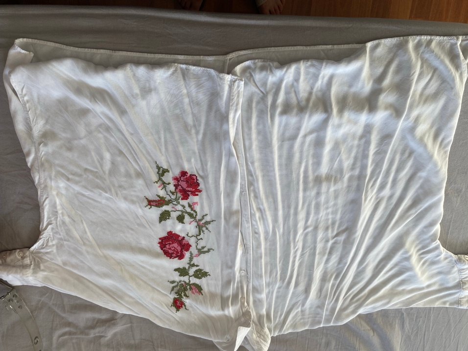 Kırmızı ve yeşil nakışlı çiçek desenli beyaz keten gömlek