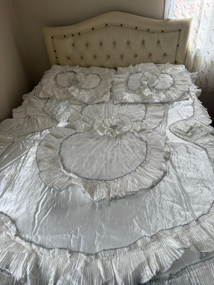 Gri ekru krem nakışlı çiçek desenleri ve fırfırlı kenarlarıyla beyaz yatak örtüsü, zarif ve şık bir görünüm sunar. ️Perdesi de içinde dahil