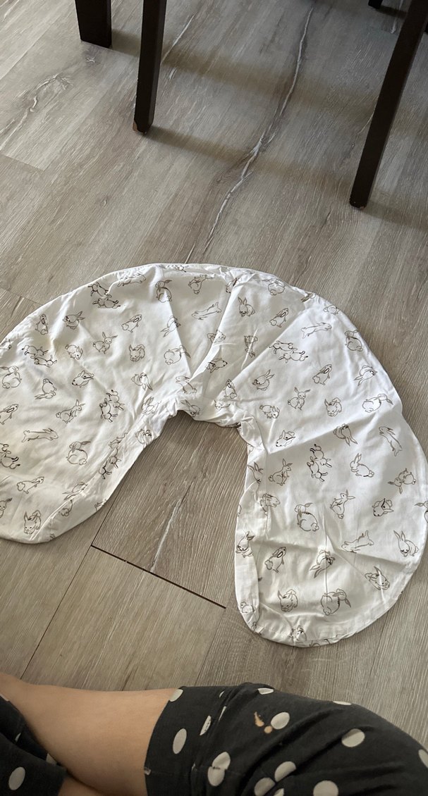 Nakışlı desenlere sahip beyaz ve gri renklerde emzirme ve hamile yastığı, rahat destek sunar.