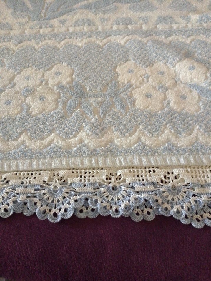 Nakışlı çiçek desenleri ve dantel kenarı olan beyaz ve gri renklerde, klasik tarzda havlu.