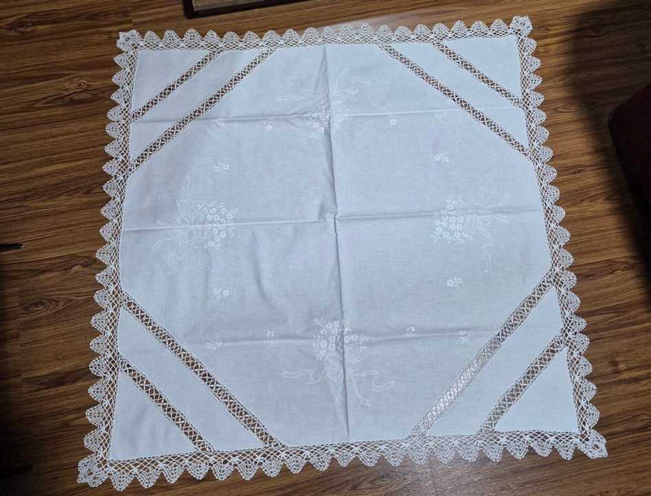 Gri nakışlı çiçek desenleri ve dantel kenarlarıyla beyaz masa örtüsü, geleneksel tarzda. Masanıza klasik bir dokunuş katar. komple elişidir. ajurlu, sarma işli cay masası kusursuz