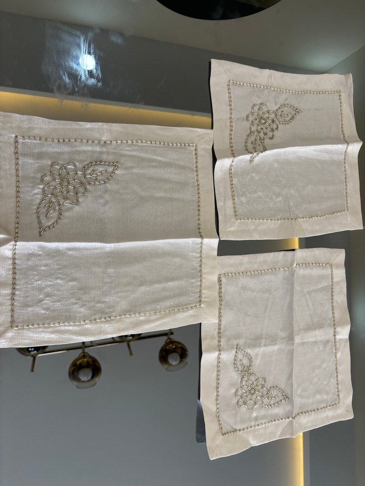 Nakışlı gri çiçek desenleriyle süslenmiş, klasik beyaz masa örtüsü takımıdır. 3 tane peçetelik küçük boy #takım #gelin #bohça #çeyiz #beyaz #krem #örgü #peçetelik #tığ #boncuk #elişi #örtü #kadın