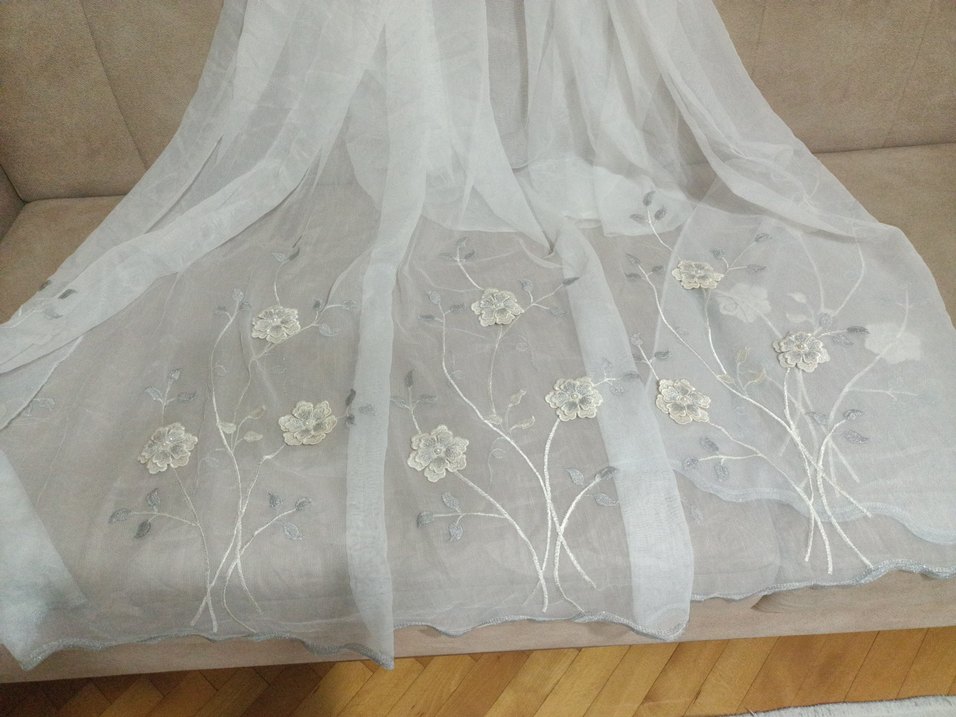 Geleneksel tarzda, beyaz kumaş üzerine gri nakışlı çiçek desenleri bulunan perde.dikişsiz ve pilesiz bir ürün.hiçbi defosu yok tertemiz yıkanıp kaldırıldı.EN 2 METRE BOY 3 METRE