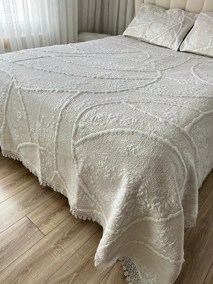 Nakışlı gri desenlere ve ince dantel kenarlara sahip beyaz yatak örtüsü, kumaşa zarif bir doku katıyor. ️