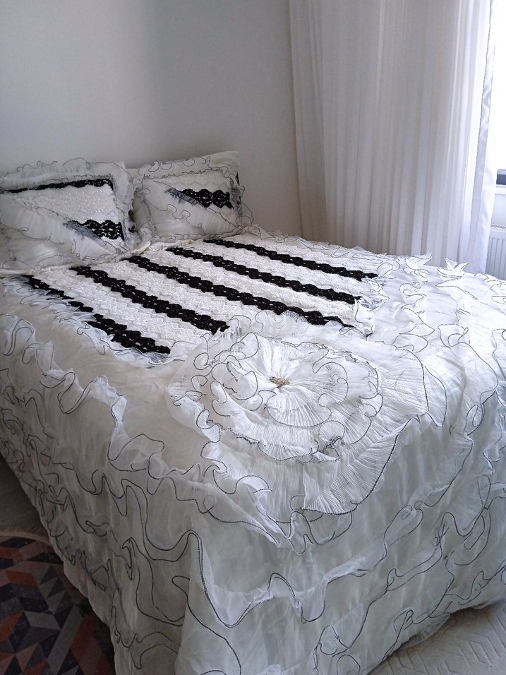 Gri nakışlı, fırfırlı kenarlarıyla beyaz yatak örtüsü. Üzerine uyumlu yastık kılıfları da dahildir. ️
