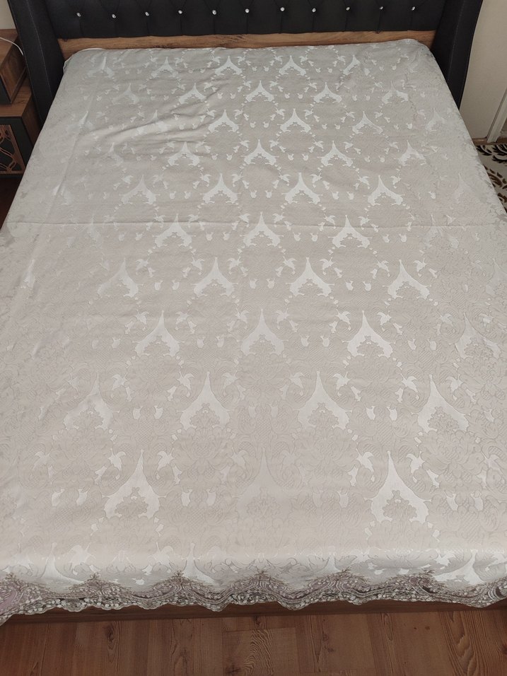 Nakışlı desenli, beyaz ve gri tonlarda yatak örtüsü, yatağa zarif ve yumuşak bir görünüm kazandırır. ️iki tanede yastık kılıfı vardır.