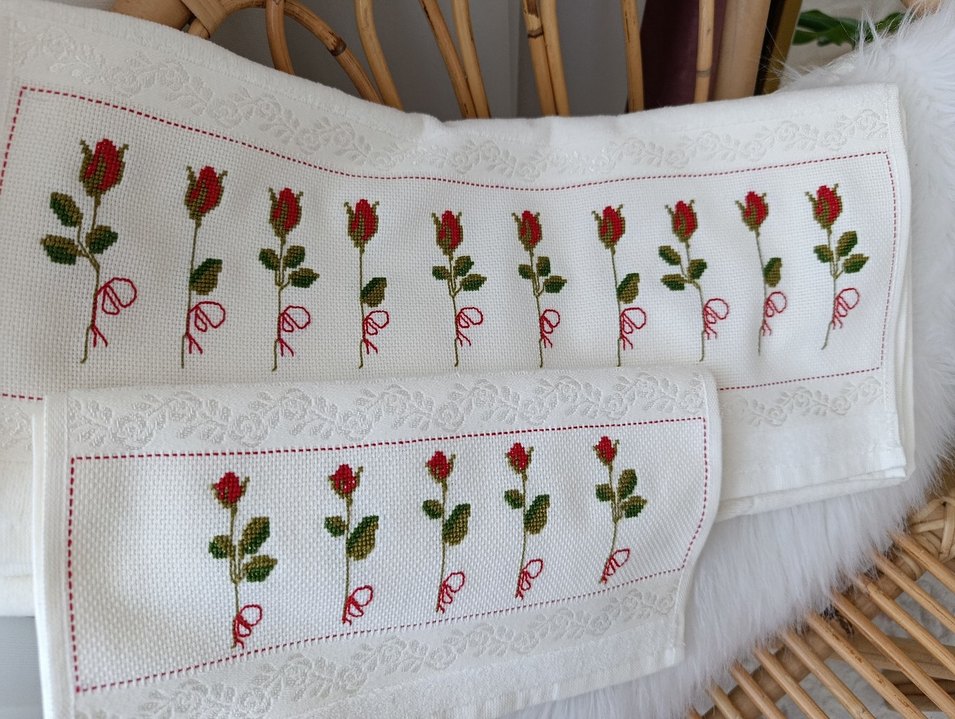 Beyaz havluların kenarında renkli nakışlı gül desenleri ve zarif çiçek bordürü bulunur. çeyizlik havlu seti yeni yapıldı ♥️