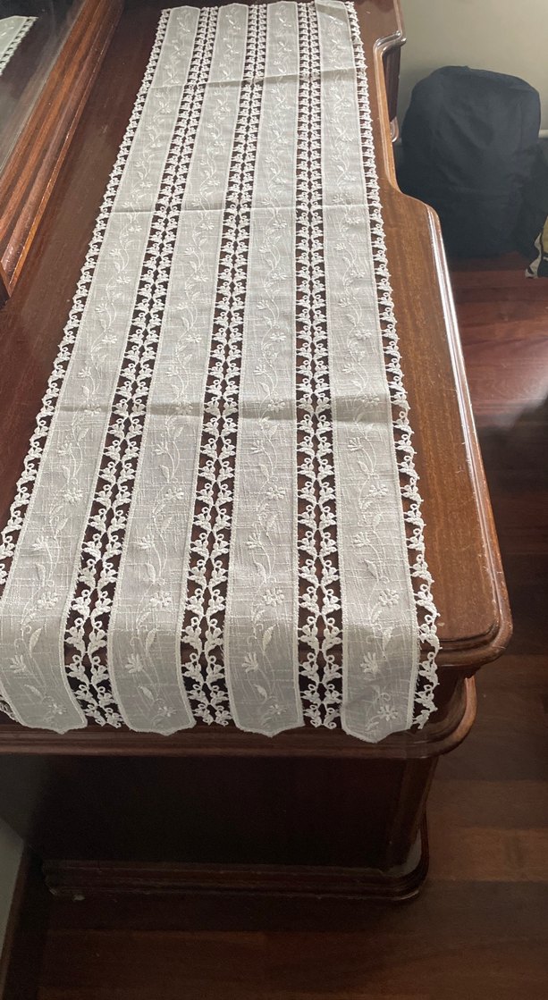 Nakışlı desenlere sahip geleneksel beyaz ve gri tonlarda Fransız Güpür masa örtüsü, masanıza zarif bir dokunuş katar. 30x130cm