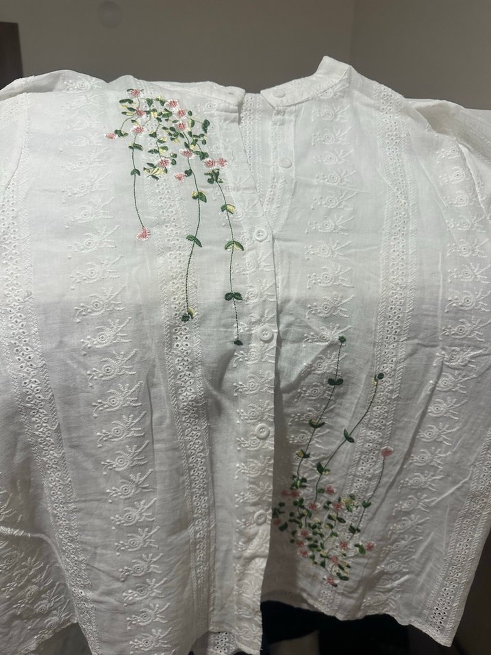 Yumuşak pamuk kumaştan, uzun kesim, loose fit hamile bluzu. Nakışlı çiçek desenleri, düğmeli ön, tekne yaka ve kısa kollu, vintage bohem tarzda.