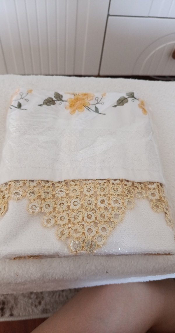 Nakışlı çiçek desenleri ve süslü danteliyle beyaz havlu, klasik ve zarif bir görünüm sunar.