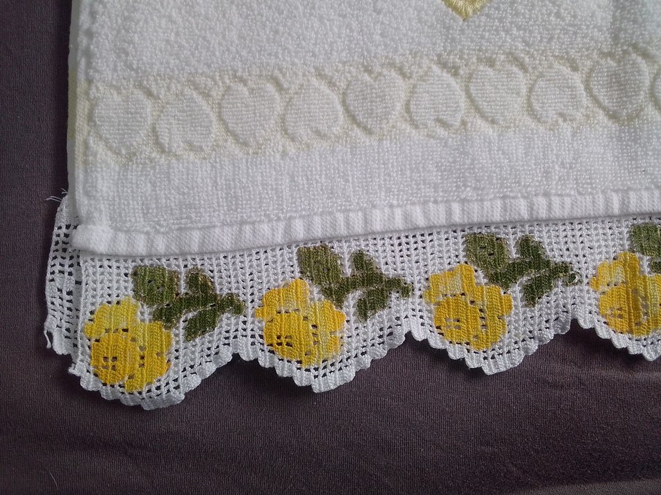 Nakışlı desenlere ve renkli çiçek işlemeli dantel detaylara sahip beyaz klasik havlu.