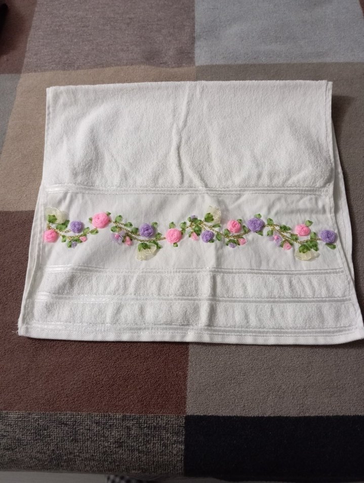 Yumuşak dokulu, nakışlı pastel renkli çiçek desenli beyaz havlu, klasik tarzdadır.