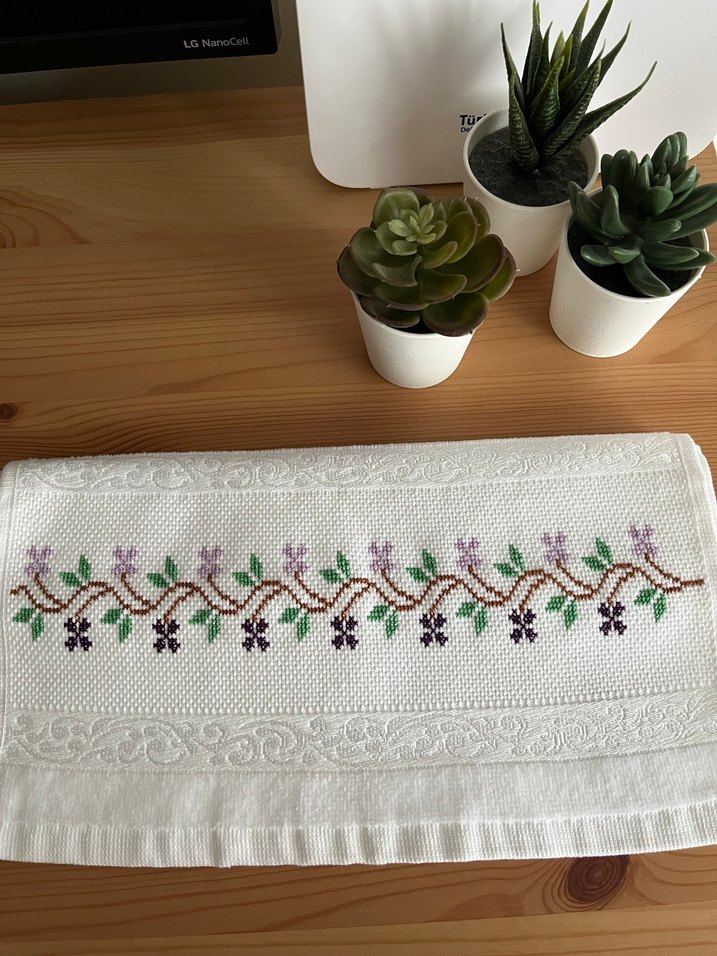 Nakışlı çiçek desenli beyaz havlu, pastel renklerde ve klasik tasarıma sahip, dokulu kenarlarla tamamlanmış.