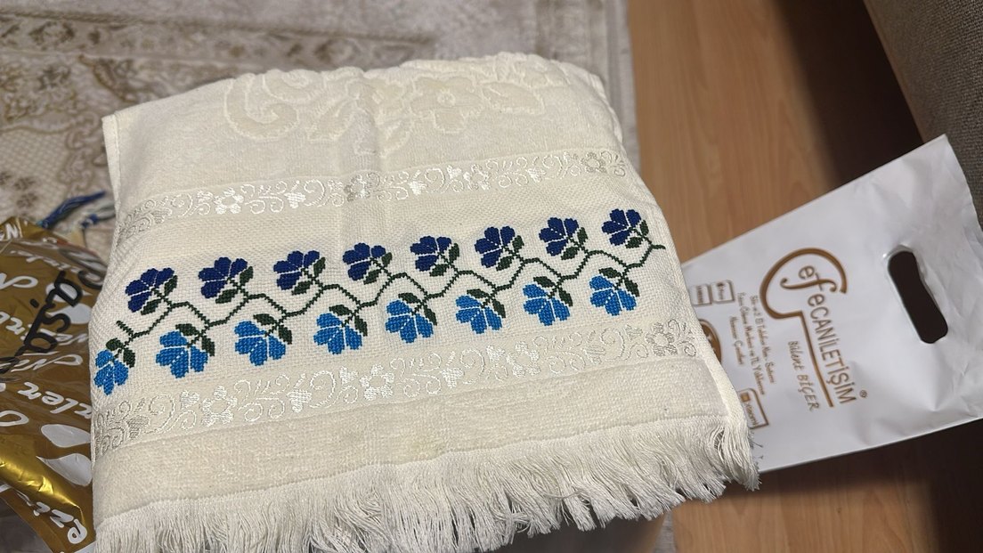 Etamin el işlemeli mutfak havlusu küçük boy Bu beyaz havlu, nakışlı mavi çiçek desenleri ve dekoratif püskülleriyle geleneksel bir tarz sunar.