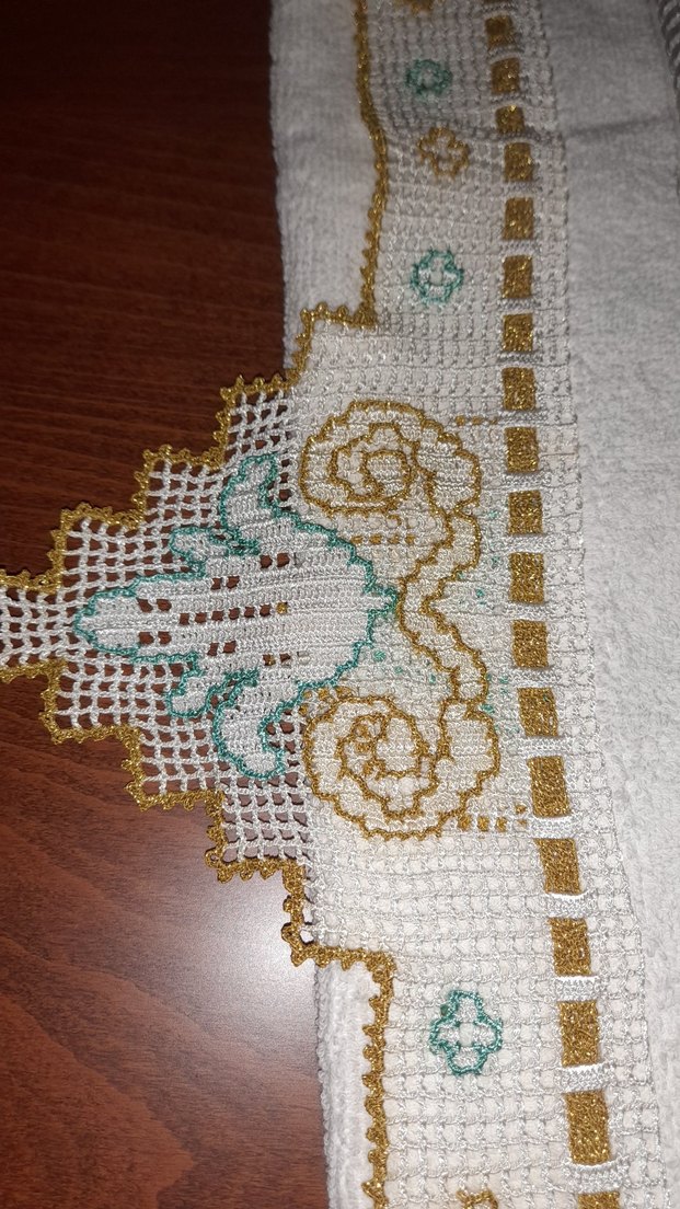 Altın sarısı ve yeşil nakışlı çiçek ve geometrik desenlere sahip beyaz havlu, dantel kenarlıklıdır.
