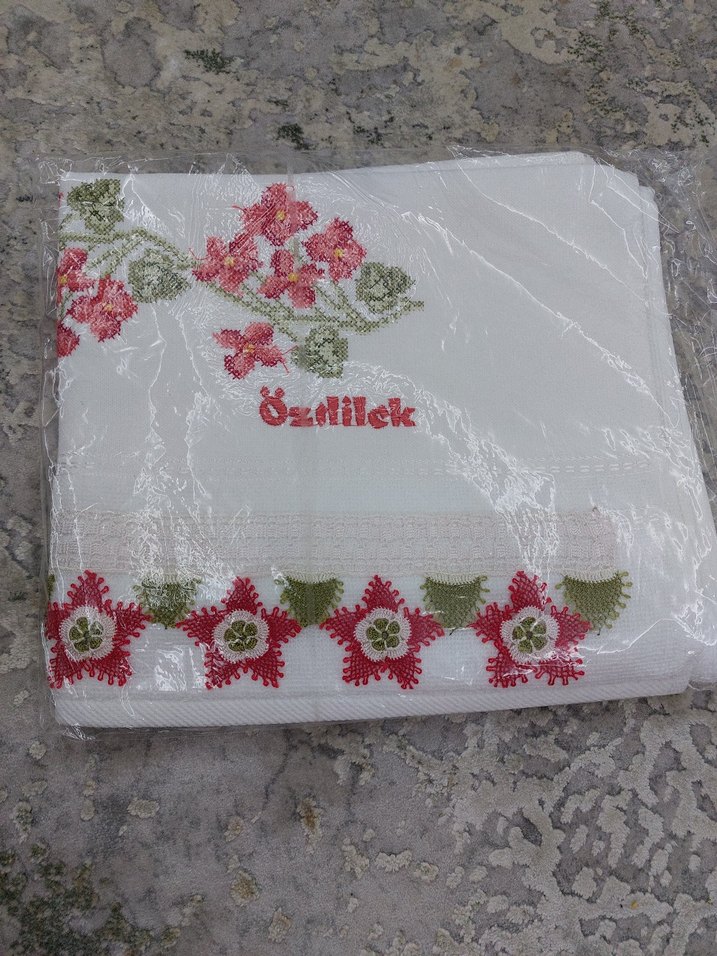 Nakışlı çiçek desenlerine sahip beyaz, geleneksel tarzda havlu, kırmızı ve yeşil detaylarla süslenmiştir.