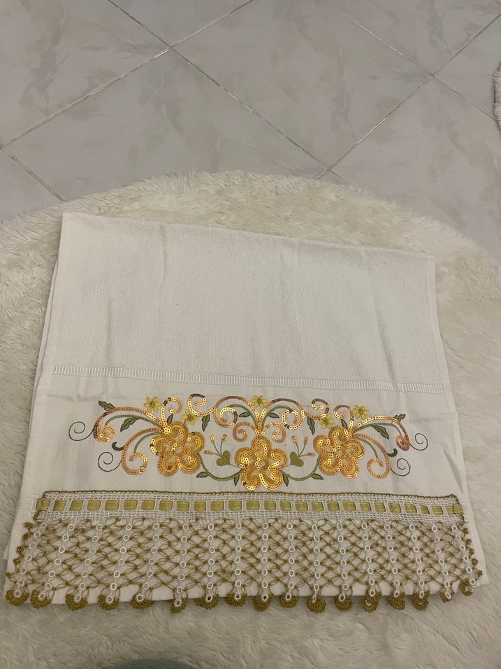 Beyaz havlu, renkli çiçek nakışları ve kenarında dekoratif dantel süslemeye sahiptir. Geleneksel tarzda, detaylı işçiliklidir. Hafif lekesi var