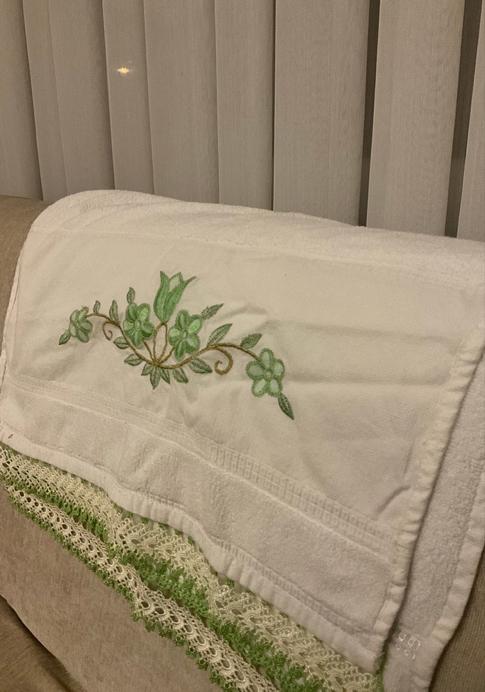 Yumuşak ve emici kumaştan yapılmış beyaz havlu, pastel yeşil çiçek nakışıyla süslenmiştir. Geleneksel tarzda, detaylı nakışlı desene sahiptir.