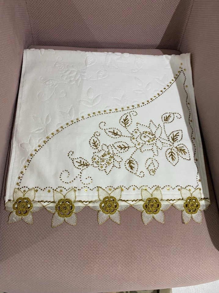 Bu beyaz havlu, zarif çiçek nakışları ve klasik tarzıyla banyo ürünlerinize şıklık katıyor. El yapımı ipne oyası kabartma desenli havluya boncuk işlendi