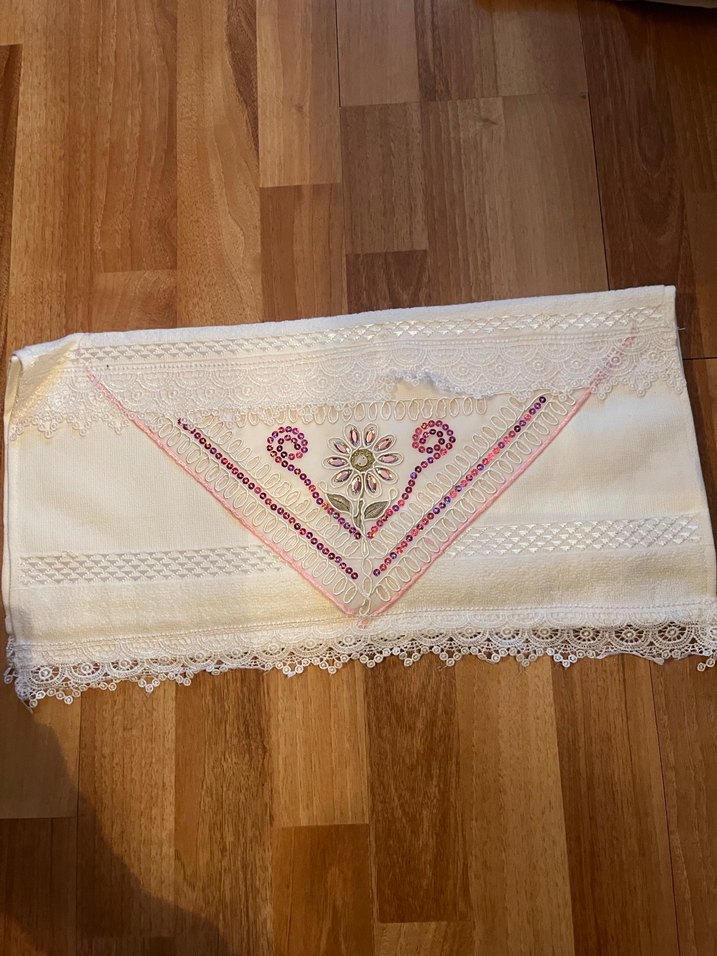 Çiçek desenli nakış ve dantel süslemeli beyaz havlu. Yumuşak ve hafif kumaştan yapılmıştır.