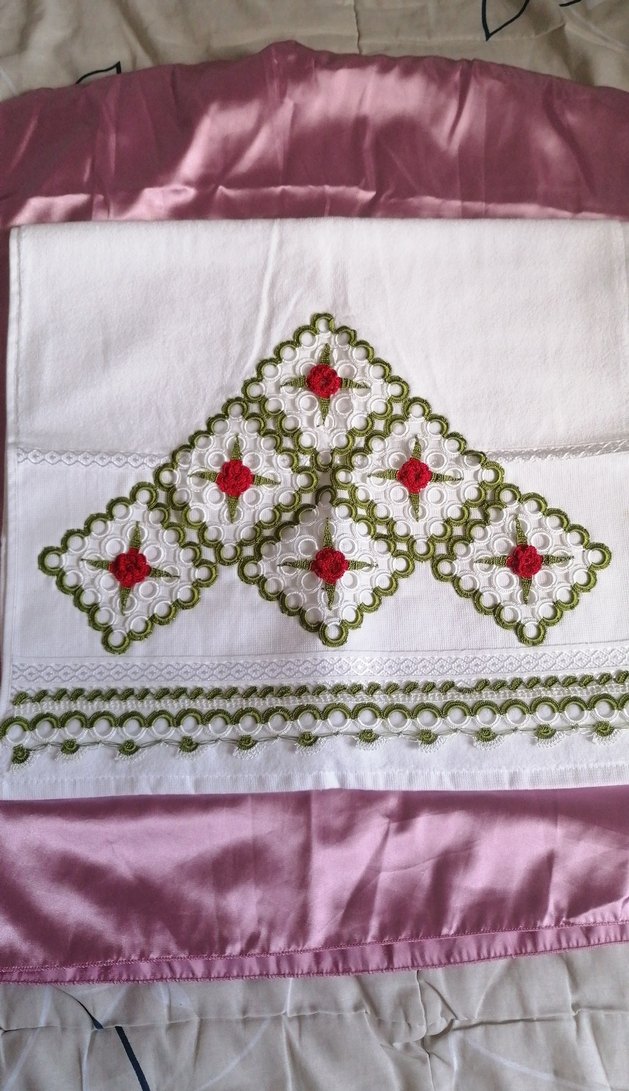 Beyaz konvansiyonel havlu, renkli yeşil ve kırmızı nakışlı çiçek desenleriyle süslenmiştir. Yumuşak ve dekoratif bir tekstil ürünüdür.
