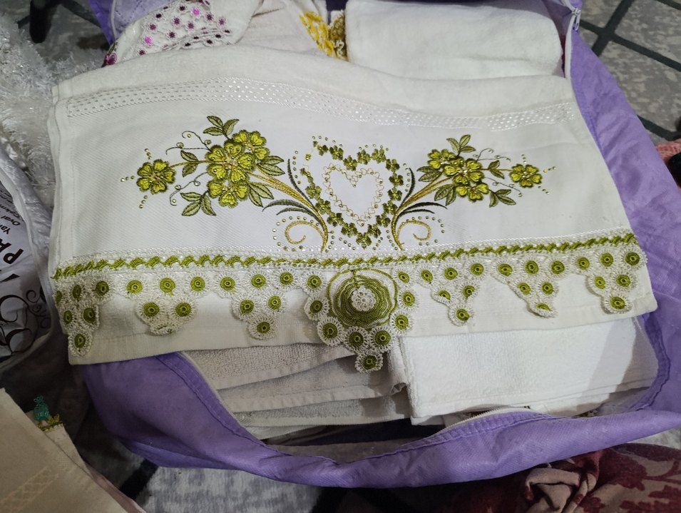 Yeşil çiçek nakışlı, kalp desenli beyaz havlu, dantel süslemeli. Yumuşak ve emici kumaştan yapılmıştır.