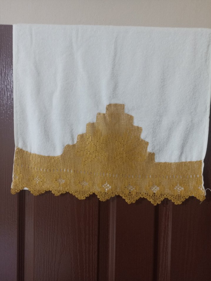 Bu beyaz havlu, kenarında altın renkli nakış detaylarıyla şık bir görünüm sunar. Geleneksel tarzda ve parlak yüzeylidir.