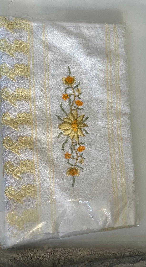 Beyaz havlu, açık sarı çiçek nakışı ve dantel detaylı klasik tasarıma sahip bambu havlu