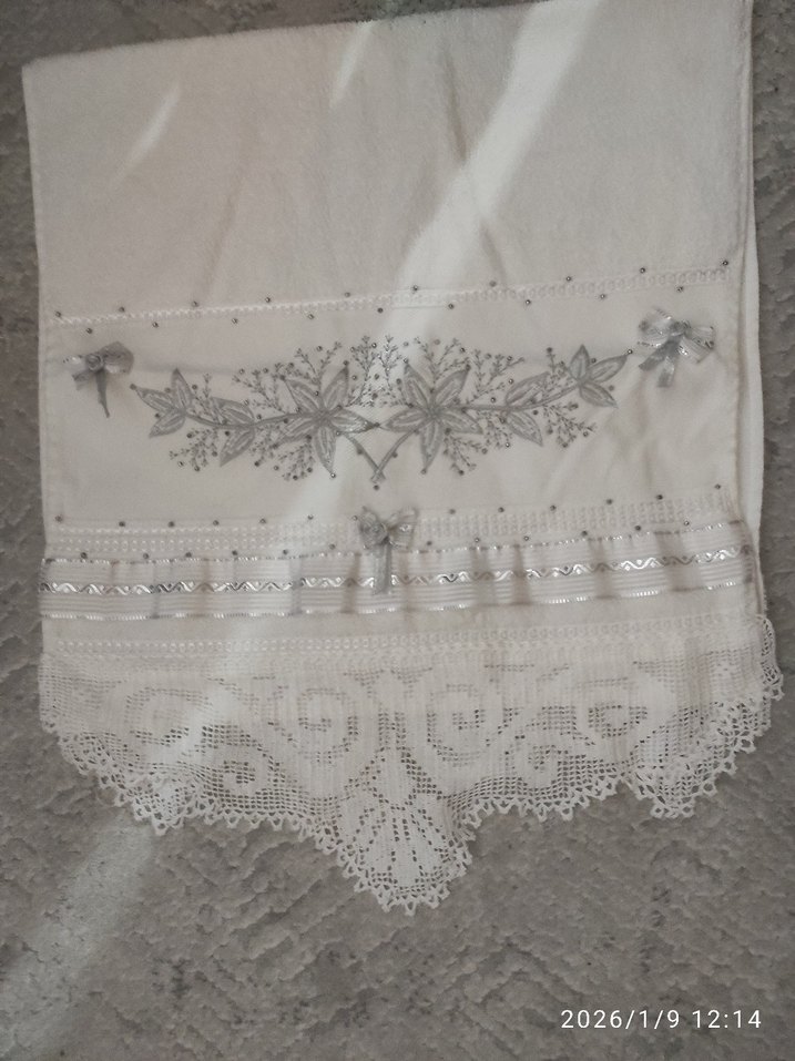 Beyaz havlu, gri nakışlı çiçek desenleri ve süslü kurdelelerle tamamlanmış, dantel detaylıdır. kalın dantel çeyizlik hiç kullnaılmadı