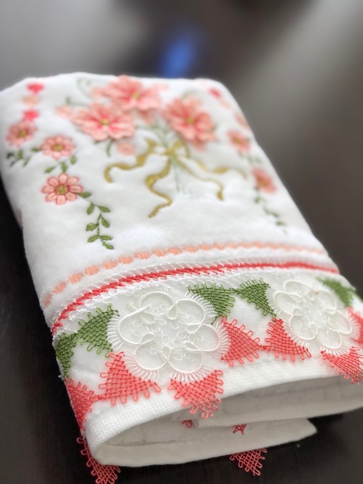 Bu beyaz havlu, renkli nakışlı çiçek desenleri ve süslü kenarlarıyla klasik bir tarzda canlılık katıyor. İki kenar işli