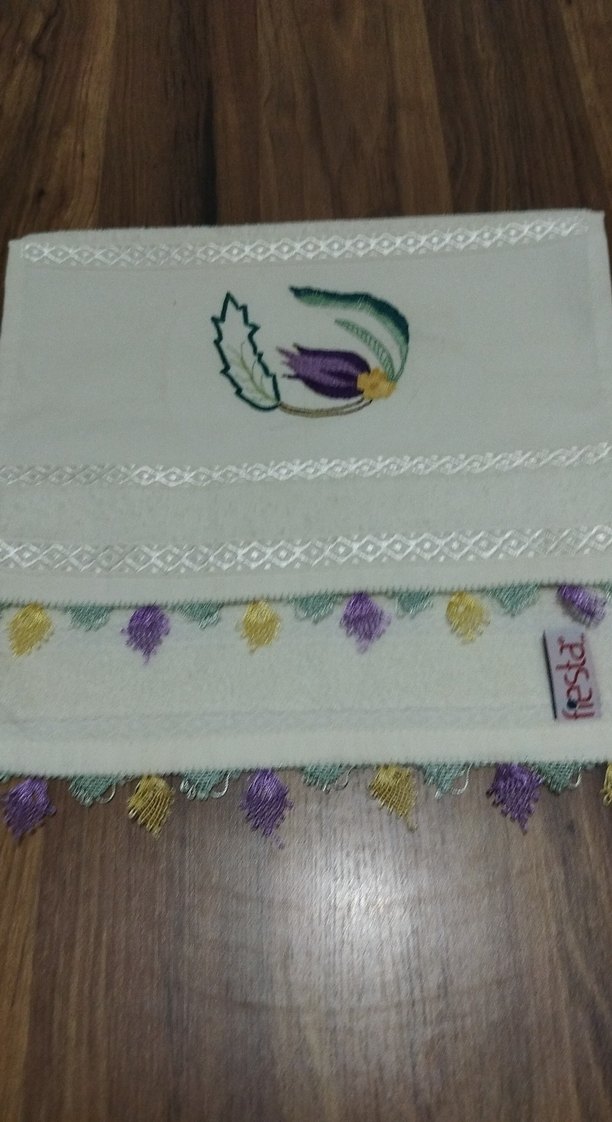 Pastel renklerde nakışlı çiçek desenleri ve ince dantel detaylarıyla beyaz geleneksel havlu seti. Kasnak isleme nakışlı kenarları iğne oyası küçük havlu.