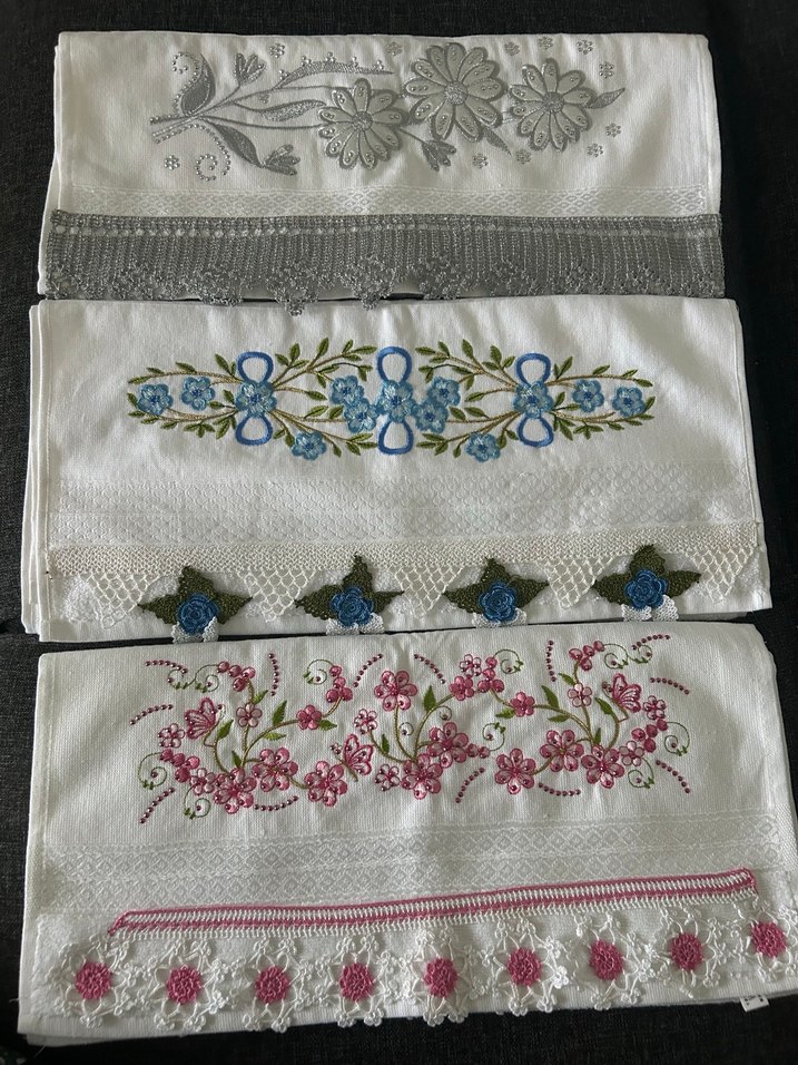 mavi çiçekli beyaz havlu 91cm x 49cm pembe çiçekli beyaz havlu 88cm x 48 cm gümüş çiçekli beyaz havlu 84 cm x 48 cm kullanılmamış yıkanmamış. biraz sandık lekesi var #Nakışlı #çiçekli #beyazhavlu